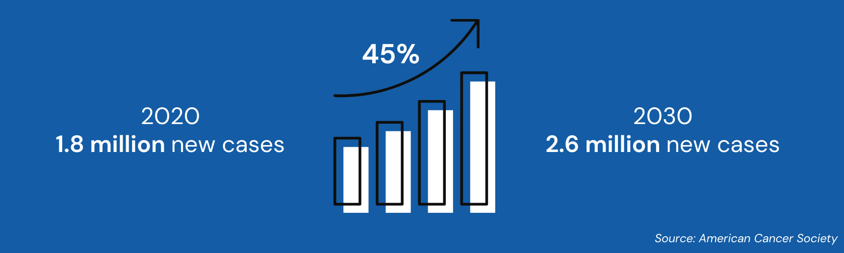 Cancer is the second leading cause of death in the U.S., and the number of cases is growing as populations increase, age, and adopt new lifestyles that increase risk for the disease. In the U.S. alone, 1 in 3 women and 1 in 2 men will develop cancer during their lifetime. The American Cancer Society estimates that there will be 1.8 million new cases diagnosed and more than 600,000 deaths as a result of cancer in 2020 alone. By 2030, the number of cases is projected to increase by 45%, resulting in an additional 800,000 new cases diagnosed in the U.S. each year.