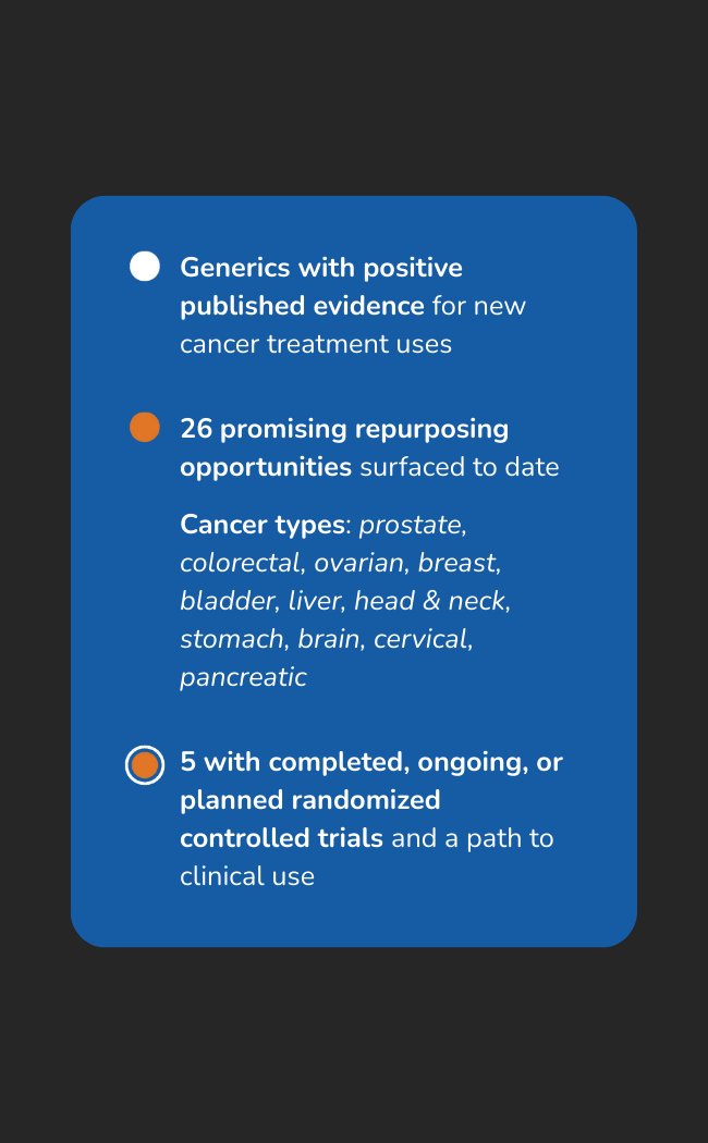 Reboot Rx identifies and helps move forward new uses for FDA-approved generic drugs with evidence for cancer treatment, which are rarely advanced through traditional commercial pathways once patents expire.