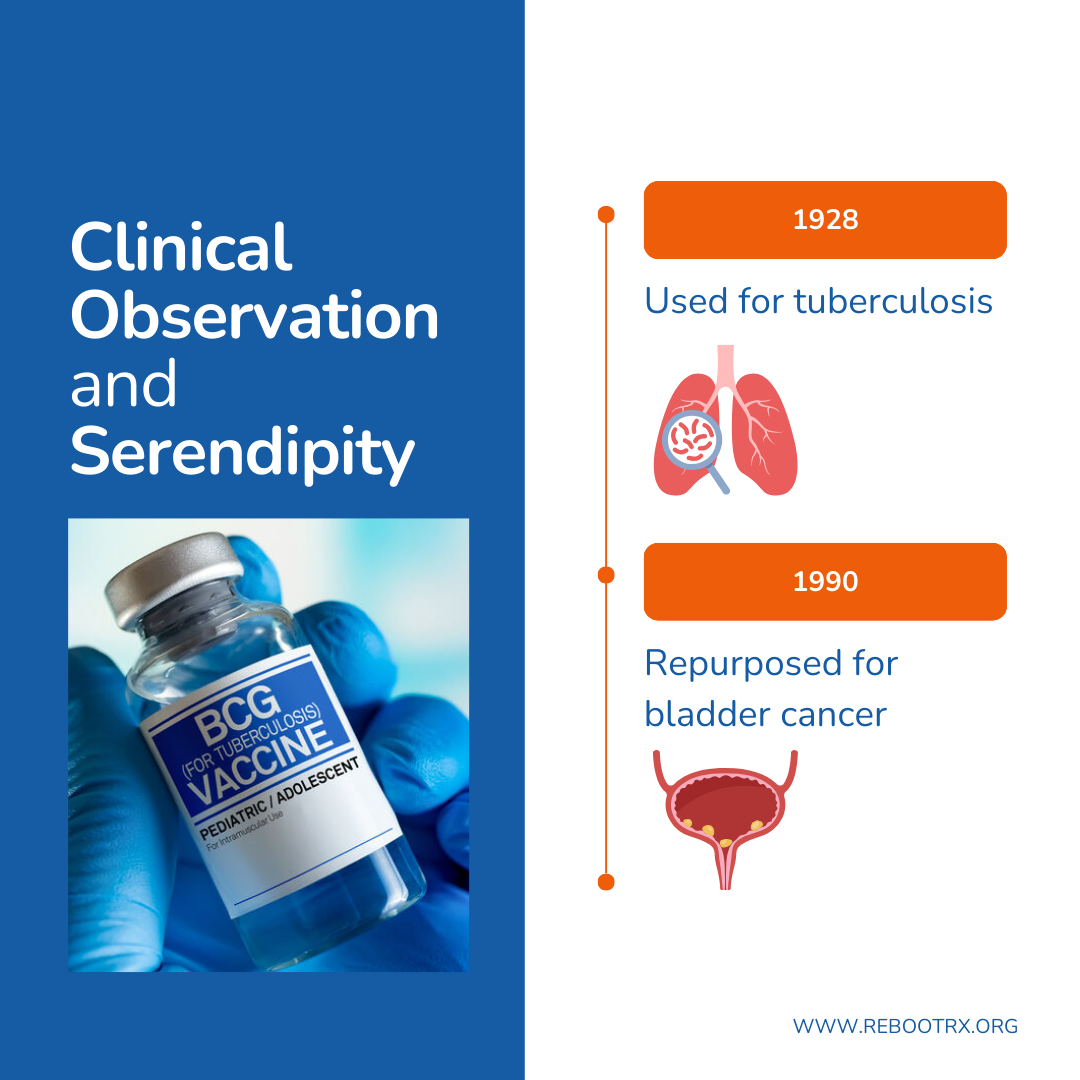 Mechanism-based approaches represent just one path to repurposing; equally important are insights gained directly from clinical practice or unexpected observations. Historically, attentive observation of patients receiving a drug for its approved indication has revealed unanticipated therapeutic effects for different conditions, and in some cases, serendipity has led to major breakthroughs in treatment.