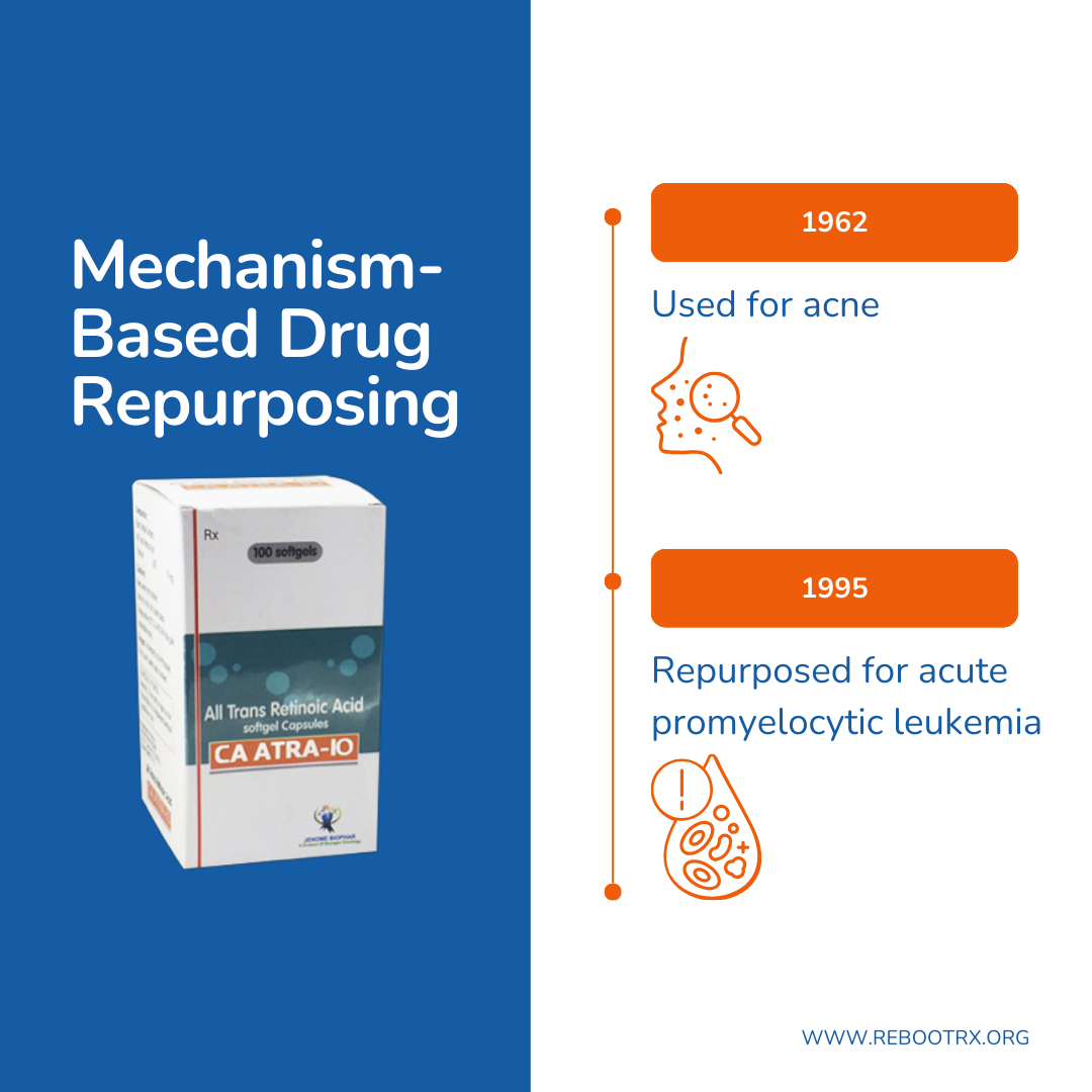An example is all-trans retinoic acid (ATRA), a vitamin A derivative introduced for acne in 1962. In acne, ATRA binds normal Retinoic Acid Receptors (RARs) in skin cells to promote cell turnover and reduce lesions. In acute promyelocytic leukemia (APL), however, a genetic rearrangement fuses the promyelocytic leukemia (PML) and RARα genes to create an abnormal fusion protein, PML-RARα, which acts as a pathological receptor that blocks immature white blood cells (promyelocytes) from maturing properly. While ATRA targets the same receptor family in both diseases, the receptor context is different: in APL, binding the fusion receptor alters its function and releases the differentiation block, allowing leukemic cells to mature and die naturally. By connecting the drug’s molecular mechanism to the specific disease biology, researchers successfully repurposed ATRA, leading to FDA approval in 1995 and transforming APL into one of the most curable leukemias.
