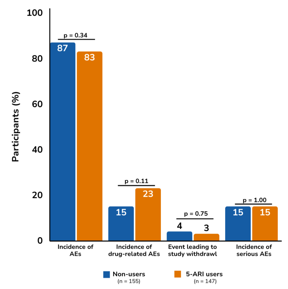 There were no significant differences in adverse events related to sexual function, breast disorders, or cardiovascular events. Sexual or breast-related adverse events occurred in 24% of men receiving dutasteride and 15% of men receiving placebo, and cardiovascular events occurred in 5% of men in both groups. No prostate cancer–related deaths or metastatic events were observed during the study period.